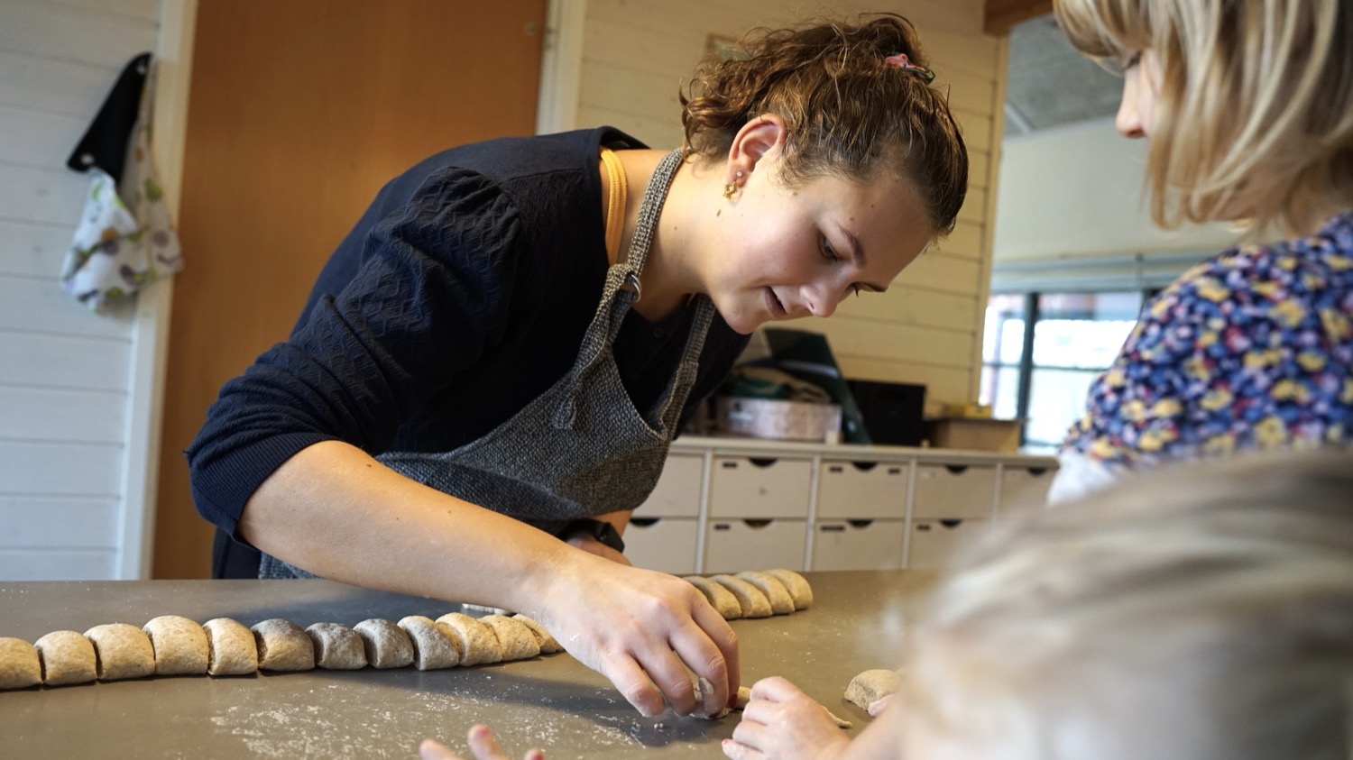 På køkkenbordet ligger dejen skåret ud i mindre stykker, der hver er klar til at blive formet til boller. 60 stk. er der i alt. Selina har talt efter for at være helt sikker på, at der er lune eftermiddagsboller nok til alle børnene. Nogle af dejklumperne bliver til traditionelt formede boller, mens kreative børnefingre former andre til blomster og pizzasnegle.